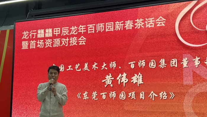 中國工藝美術大師、百師園集團董事長黃偉雄歡迎各位嘉賓到來同時重點介紹《東莞茶山鎮百師園項目》